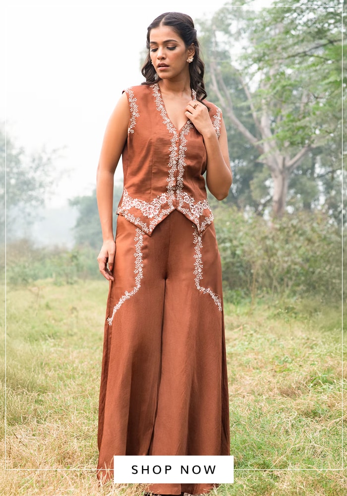 A cutwork embroidered shirt-and-pant set is a sophisticated yet bold pick to try this bold hue and transition effortlessly from work to dinner transitions or even attend chic brunches.